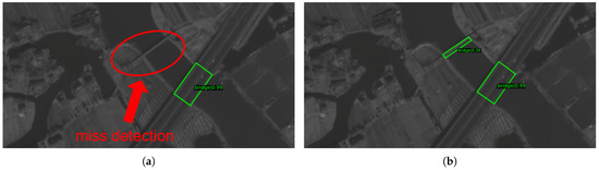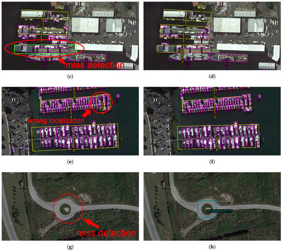 Figure 11 presents the detection result comparisons of our method with the baseline method. The left images are the baseline method’s outputs, and the right images are the outputs of our method. In the comparison between the first two groups, the outputs of the baseline method (Figure 11a,c) missed the detection of narrow objects, Bridge and Harbor. On the contrary, our method detected these two narrow aspect ratio objects accurately (Figure 11b,d). The bounding box of the baseline method in the third group has been cut into two segments (Figure 11e), which indicates the wrong localization. The final comparison is a roundabout on the edge of an image; the baseline method omitted the roundabout (Figure 11g), but ours detected it correctly. This reflects that our method also possesses the ability to detect objects in normal aspect ratios. These visualized results prove that our horizontal and vertical convolution method is skilled in narrow object detection and correctly detecting general objects as well.
