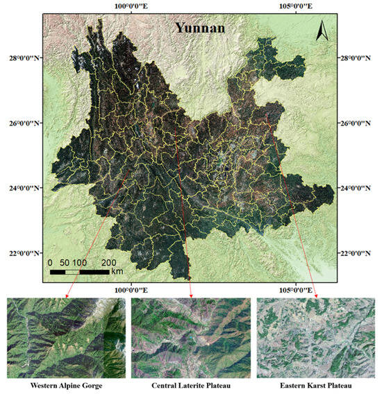 The study area is Yunnan, one of the most landslide-prone provinces in China [36]. By the end of 2021, there were 18,501 recorded landslide hazards in Yunnan [37], accounting for 33.26% of the total number of landslide hazards in Southwest China. Yunnan is located between 21°8′ to 29°15′ north latitude and 97°31′ to 106°11′ east longitude, with a total area of 394,000 square kilometers, and all kinds of mountains account for 80% of its total area. The topography of Yunnan is complex and varied, dominated by plateau mountains. The overall terrain is higher in the northwest and lower in the southeast in Yunnan, with a significant elevation difference. Complex topography and distribution of steep slopes provide favorable conditions for the formation of mountain landslides; frequent earthquakes in fault zones cause mountains to break up and provide geological conditions for the formation of landslides; moreover, heavy rainfall is the main trigger for landslides in Yunnan. Yunnan Province has western, central, and eastern topographic regions, as shown in Figure 1. Western Yunnan is an alpine gorge region, which is characterized by mountain valleys in the high north and low south, and the region has a large mountain drop and intense tectonic activities. The central Yunnan region is characterized by a laterite plateau with obvious red soil outcrops and significant differences in the softness and hardness of the strata. East Yunnan belongs to the karst plateau, with obvious karst landforms, rugged and broken terrain, and relatively sparse vegetation coverage. We sampled landslides from these three regions to ensure the diversity of topographic and geomorphic qualities in the dataset.