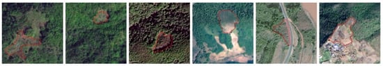 Some sample landslide images in the dataset and their corresponding labels are shown in Figure 5, from which we can find the different terrain and shapes of landslides.