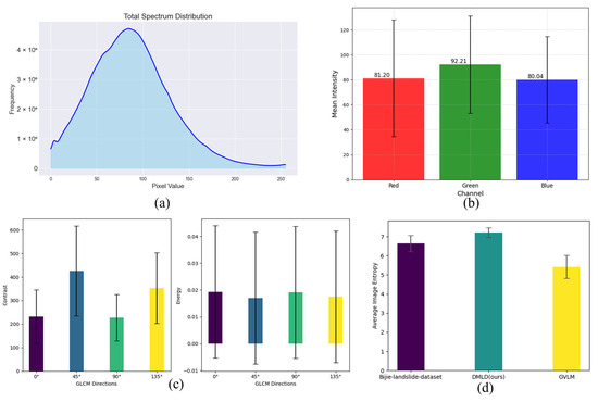 Statistical information about the dataset images. (a) Shows the histogram of spectral distribution, (b) displays the mean and variance of each band, (c) presents the contrast and energy calculated from the GLCM, and (d) illustrates the contrast results from Shannon entropy.
