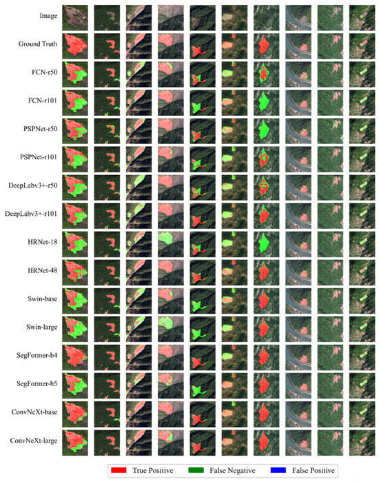 To evaluate the adaptability of advanced deep learning models on the DMLD dataset, seven SOTA models were selected for the experiments. The quantitative evaluation results of all seven models and their different versions are shown in Table 4. FCN, PSPNet, and DeepLabv3+ all use ResNet-50 and ResNet-101 as backbones, and the loss function used by all models is Binary CrossEntropy. In the training results of 60 k iterations, the base version of ConvNeXt achieved the highest accuracy metrics, with an IoU reaching 90.59%, recall reaching 94.14%, and F1 score reaching 95.06%, indicating that this model fitted the dataset well. The SegFormer-b5 achieved the second-highest IoU of 89.51% and a 94.47% F1 score, while having smaller parameter and computational complexity, with params only at 81.97 m. In terms of precision, PSPNet achieved the highest performance among the different models, with PSPNet-r50 reaching the highest precision of 98.61%, but recall ranked second lowest at 76.35%, indicating a higher number of missed detections. It is worth noting that precision was higher than recall for all models, which indicates a better performance in ensuring prediction accuracy, but a weaker ability to detect all real landslides, and some false positives in model results. The three advanced models, SegFormer, Swin Transformer, and ConvNeXt, performed well in balancing recall and precision. Among them, ConvNeXt achieved the best balance of precision and recall through multiple optimizations of the model structure. FCN, PSPNet, DeepLabv3+, and HRNet were able to obtain high precision but low recall values. A lower recall value indicates a higher number of undetected landslides.