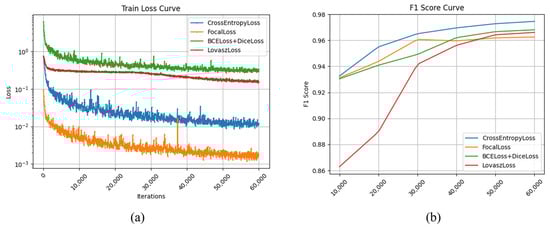 In order to track the impacts of different loss functions in the training process, we visualize the training–loss curves and the F1 score change curves under different loss functions, as shown in Figure 7. As the number of iterations increases, all four loss functions decrease during training, and by 60,000 iterations, they are close to convergence. Among them, the Focal Loss decreases very quickly at the beginning of training and can fit the dataset quickly. According to the F1 score curve, the Focal Loss is close to convergence at about 40,000 iterations, and the Lovasz Loss converges slowly at the beginning of the training period, but the convergence rate increases rapidly as the number of iterations increases. Both the training–loss curves and the F1 score curves indicate that the models corresponding to the four loss functions have stabilized by the end of training.