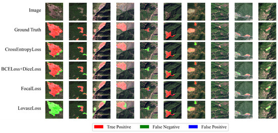 We selected some representative landslide samples, including small landslides and easily confused landslides, to qualitatively test the models trained with different loss functions, as shown in Figure 8. From the qualitative test results, it can be seen that the Focal Loss-based model can distinguish small landslides and easily confused landslides well. Focal Loss can strengthen the focus on hard-to-classify samples by reducing the weights of easy-to-classify samples. However, since most of the landslides in the dataset are easy to classify and have clear features, Focal Loss’s reduction of the weights of the easy-to-classify samples may lead to a decrease in the overall accuracy, but it performs well on the difficult-to-classify samples. BCE Loss combined with Dice Loss can improve the recognition rate of small landslides and help to solve the category imbalance problem. Lovasz Loss performs poorly on the dataset and is difficult to adapt to some simple landslide samples, because Lovasz Loss focuses more on overall category boundary matching, resulting in insensitivity to small landslides and confusing regions. According to the above result analysis, we can know that the CrossEntropy Loss can be used for landslide extraction tasks focusing on overall accuracy, and Focal Loss can be used for tasks focusing on small landslides.