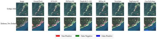 The two selected landslide regions contain large continuous landslides, which are rare in our dataset, challenging the completeness of landslide identification. We used the highest-accuracy versions of the trained models in this study to test on Kodagu and Kaikoura, and the results of the quantitative evaluation are shown in Table 6 and Table 7. From the tables, we can find that FCN achieved the highest IoUs and F1 scores in both regions, with the IoUs and F1 scores reaching 58.41% and 73.75% in Kodagu, and 51.73% and 68.19% in Kaikoura, which indicates that FCN has a good generalization ability and a significant advantage over other models. The good generalization of FCN is due to its simple network structure, which replaces the fully connected layers in traditional CNNs with convolutional layers, thus reducing the complexity of the model and the risk of overfitting. HRNet has the highest recall in Kodagu at 65.99% and the second-highest F1 score at 64.24%. In Kaikoura, HRNet performed similarly to FCN, with F1 score and IoU falling behind by less than 1%. DeepLabv3+ had the highest precision in both regions, reaching 93.95% in Kodagu and 95.39% in Kaikoura, but had significantly lower recall. Moreover, recall is lower than precision for all models, indicating that the DMLD differs from Kodagu and Kaikoura in landslide features and image background, which makes it difficult for the models to completely recognize landslides on Kodagu and Kaikoura. ConvNeXt, which performed best on the DMLD dataset, did not perform well in terms of generalization, achieving only a 17.95% IoU and 30.43% F1 score in Kodagu, and achieving a medium-level performance in Kaikoura. The landslides in Kodagu are characterized as long continuous bare landslides with features similar to some bare ground in the DMLD, which may have led the model to identify the landslides as the background. The landslides in Kaikoura are distributed in patches next to roads, and there are numerous similar roadside landslide samples in the DMLD. ConvNeXt has a superior learning ability and fitted the training set well in 60,000 iterations with some tendency of overfitting. As a result, ConvNeXt performed worse in Kodagu, which is more different from the DMLD, and better in Kaikoura, which is more similar to the DMLD. Among the Transformer architecture models, SegFormer achieved the third-highest IoU and F1 score in Kodagu, while Swin Transformer achieved the third-highest IoU and F1 score in Kaikoura. The attention mechanism in Transformer models allows them to obtain global contextual information, contributing to improved generalization. Overall, the generalization performance of various models is better in Kaikoura than in Kodagu, mainly because Kaikoura’s terrain context is closer to the DMLD.
