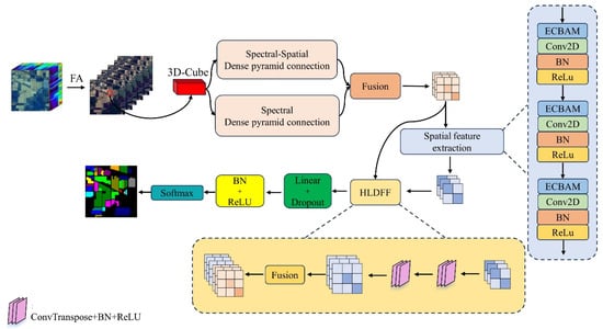 We introduce an improved efficient channel–spatial block attention module (ECBAM) in the spatial feature extraction stage to efficiently allocate computational resources and enhance the learning of salient spatial features. In addition, we propose a high–low deep feature fusion strategy (HLDFF). HLDFF involves the deconvolution of high-level feature maps generated after convolutional kernel sizes of , and in that order, up-sampling them to the same size as the low-level feature maps, and then splicing the two feature maps together channel-by-channel to obtain a richer representation of the features, thus enhancing feature reuse. Finally, the fully connected layer is used as a classifier to complete the classification task.