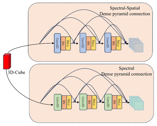 Given that HSI is a 3D cubic structure with spatial–spectral binding, in 3D convolution, the 3D convolution kernel can be moved in all 3 directions (height, width, and channel of the image). At each position, the multiplication and addition of elements provide a number. Since the filter slides in 3D space, the output digits are also arranged in 3D space, and then the 3D data are output. HSI contains rich one-dimensional spectral information and two-dimensional spatial information; therefore, we adopted 3D-CNN as the convolution module and utilized its excellent computational power as the base building block of the two-branch dense pyramid structure.