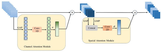 ECBAM consists of two separate sub-modules: the channel attention module and the spatial attention module. In the channel attention module, the convolutional features are aggregated using GAP. We believe that the cross-channel information capturing ability of convolution is very strong; therefore, we used the traditional fully connected layer and instead performed one-dimensional convolution with the convolution kernel size set to 3. Subsequently, the output feature maps are multiplied by the Sigmoid activation function, and finally, the output feature maps are multiplied by the input feature maps to obtain the output feature maps of the channel attention module, as shown in Equation (3). The second module of ECBAM, the spatial attention module, is introduced next. We take the feature maps generated by the channel attention as the input feature maps of this module. The spatial attention module first performs the channel-based global maximum pooling and global mean pooling to connect the respective outputs by the channel dimensions, performs the convolution operation with a convolution kernel of 7, and finally multiplies the output feature maps with the input feature maps to generate the final feature maps . The whole process is shown in Figure 4.