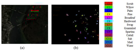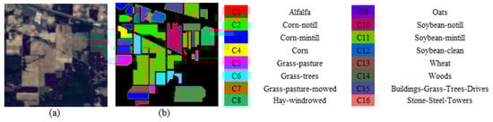 IP: The scene was collected using an airborne visible/infrared imaging spectrometer (AVIRIS) at IP Proving Ground, NW India. It contains 145 145 pixels, 224 spectral bands in the wavelength range of 0.4 to 2.5 μm. Then, 24 of the spectral bands were removed due to water absorption and damage. The reference feature targets were designed as 16 vegetation classes. As shown in Figure 5.