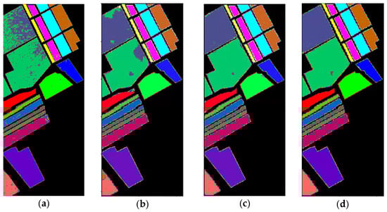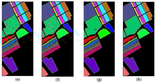 SA: The dataset was acquired by the AVIRIS sensor (224 bands) over the SA Valley, California, USA, with a spatial resolution of 3.7 m. The coverage scene is presented in 512 rows and 217 columns of pixels, and 20 absorbing and noisy spectral bands have been discarded. The feature targets in this dataset totaled 16 categories. As shown in Figure 8.