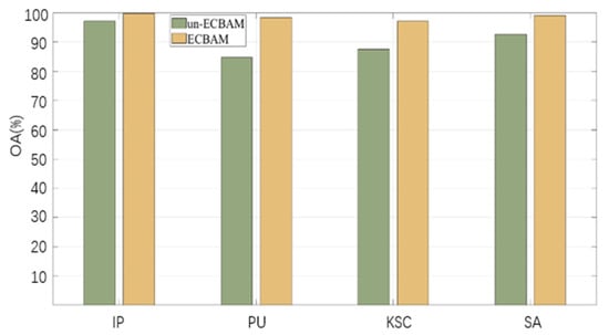 In order to verify the effectiveness of ECBAM, the channel–spatial attention module proposed in this paper, we conducted ablation experiments on four representative datasets. As shown in Table 8 and Figure 13, on the four datasets, OA increased by an average of 8.05%, and even more so on the PU dataset, which increased by 13.57%, AA increased by an average of 11.47%, and increased by an average of 0.1. The results of the ablation experiments proved the effectiveness of ECBAM, and the incorporation of the ECBAM module in the model can significantly enhance the performance of model classification.