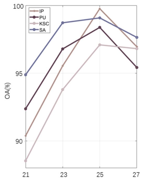 The patch block size of an image is one of the most important hyperparameters in the model. Its impact on the classification performance of the model is significant because the size of the patch window determines the abundance of spatial information extracted from the patches, and according to the inherent experience, the larger the size of the patch window, the richer the spatial information extracted, and thus, the higher the classification performance of the model. However, if the patch window is too large, it will lead to the data overlapping problem, decreasing the classification performance of the model. In order to evaluate the effect of the size of the image patches on the performance of the FHDANet model, we set the window size of the patches to 21 × 21, 23 × 23, 25 × 25, 27 × 27; the OA of the model is used as the evaluation criterion. As shown in the Figure 14, we clearly found that as the window size of the patch increased, the obtained OA increased, proving that the classification accuracy gradually increases; however, when the OA reaches the peak, we found that the window size is 25 × 25 at this time, proving that the window size applicable to the present model is 25 × 25. In addition, we also found that when the window size increases, the classification accuracy of the model firstly increases and then decreases. In summary, for all the experiments in this paper, we take the optimal patch window size of 25 × 25.