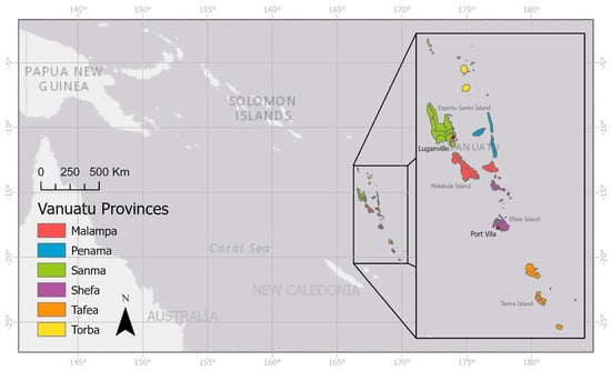 Map of Vanuatu in context of the South Pacific. Vanuatu Provinces are labelled, and Council Area boundaries are shown. The main cities of Port Vila (capital) and Luganville are labelled.