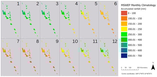Accumulated rainfall averages for each month (mm) from MSWEP data for 1980–2021. Months are labelled from 1 (January) to 12 (December).