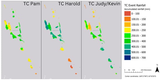 Accumulated rainfall (mm) over 5 consecutive days of highest TC rainfall for TC Pam, TC Harold, and TCs Judy/Kevin.