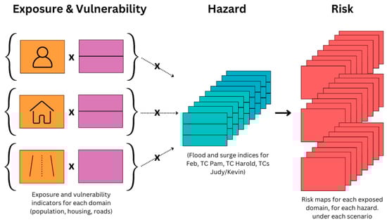 The risk calculation we used in this study follows what is commonly used in the literature, where risk is the product of hazard, exposure and vulnerability [33,34], as presented by Equation (2). For a region to be at risk, there must be exposed assets with some vulnerability to the potential hazard.