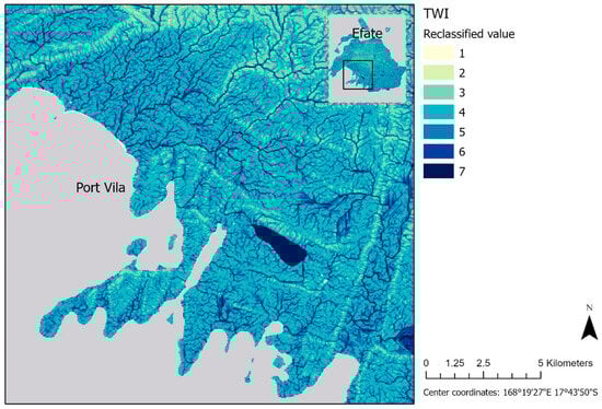 The reclassified Topographical Wetness Index (TWI) values mapped over Port Vila and southern Efate Island are presented in Figure 5.