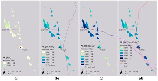 For February, values are low across the country, with slightly higher values of 0.1–0.2 across parts of the northern islands (Figure 7a). For TC Pam, AR is highest in the northeast in the Penama province with a max of 0.6–0.8, with moderate values across the rest of the country despite being far from the TC track (Figure 7b). For TC Harold, maximum AR values are reached in Sanma province and parts of Penama province within 100 km of the TC track. Port Vila received moderate rainfall, while more southern islands received values of 0–0.2 (Figure 7c). For the TCs Judy and Kevin, AR was highest in Shefa and Tafea provinces, where the two TC tracks both passed through, with moderate values along the northern path of TC Judy and west of Luganville (Figure 7d).
