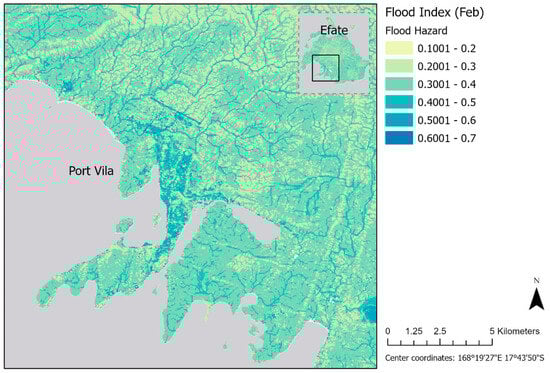 The flood index for February in Figure 8 shows similar patterns identified in the TWI and impermeability indicators, with higher values where these patterns overlapped. In particular, urban Port Vila has higher values, along with the airport strip north of the city. Outside of Port Vila, the river systems and ridges from the TWI indicator can be seen. The influence of the AR indicator is indiscernible as rainfall data came at a lower resolution and had little variation over small distances.