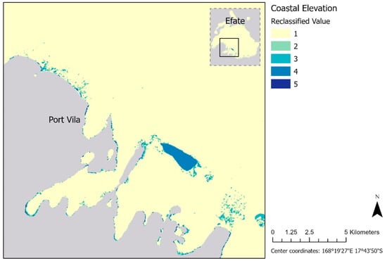 Reclassified coastal elevation values over southern Efate Island, describing low-lying regions susceptible to inundation.