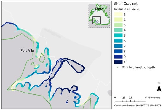 Reclassified Shelf Gradient values along the coastline of southern Efate Island. The dotted line of 30 m bathymetric depth is shown.