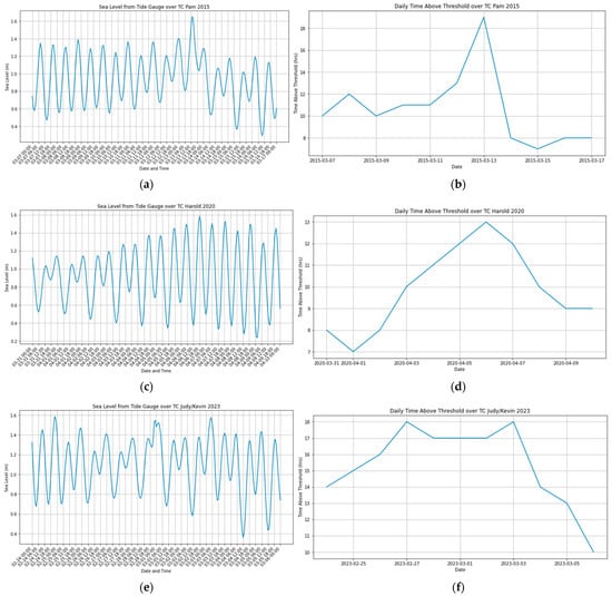 Sea level from Port Vila tide gauge (left) and daily Time Above Threshold values (right) for three days before and after the five measured event days for TCs Pam (a,b), Harold (c,d), and Judy/Kevin (e,f).