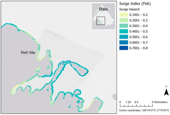 Surge hazard index for February shown over southern Efate Island.