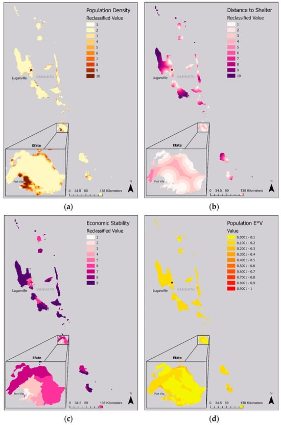 Population density (a), Distance to Shelter (b), Economic Stability (c), and Population Exposure multiplied by vulnerability (d). Values are shown over all of Vanuatu with a close-up of the extent of Efate Island. Vulnerability indicators are equally weighted into one vulnerability index before multiplication.