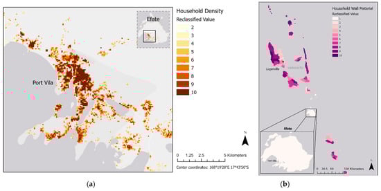 For the housing domain, exposure was informed by Household Density. Regions with more household infrastructure had more assets to lose in the case of a TC event. The vulnerability indicators specifically related to housing were Household Wall Material and Household Roof Material. These datasets were sourced from the 2016 mini-census after the impacts of TC Pam, where VNSO gathered responses on the type of materials that were mainly used in each Council Area. For our household vulnerability indicators, from the census datasets, we took vulnerability as the proportion of households that used traditional materials for walls and palm/straw for their roofs. Households that are made up of these materials are less likely to withstand the destructive impacts of a TC if they occur compared to materials such as tile, concrete, metal, cement, or brick.