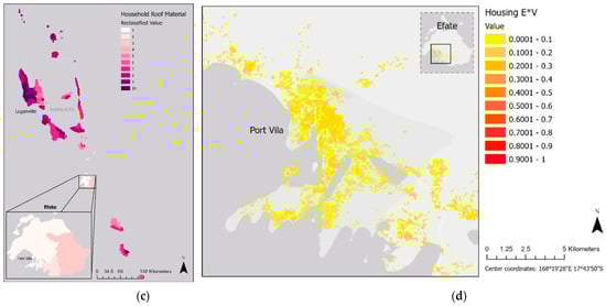 Household Density (a), Household Wall Material (b), Household Roof Material (c), and Housing Exposure multiplied by vulnerability (d). Vulnerability indicators are equally weighted into one vulnerability index before multiplication.