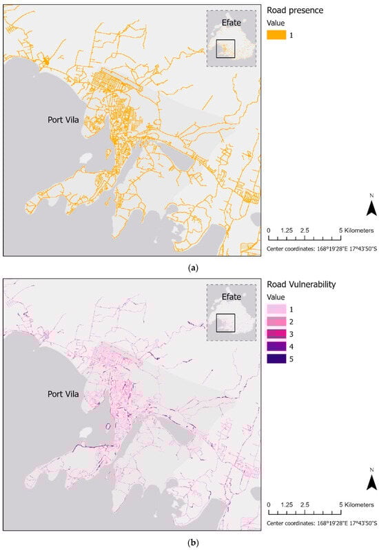 Road exposure is shown by road presence (a), and road vulnerability (b) is quantified by 5 values relative to the number of vulnerable road conditions that the location satisfies. Results are shown over southern Efate Island.