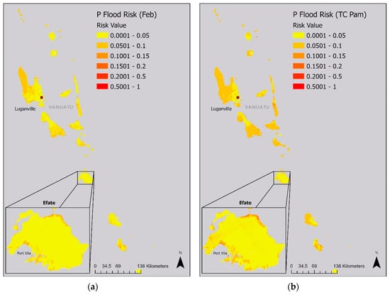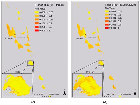Population flood risk maps for February (a), TC Pam (b), TC Harold (c) and TCs Judy/Kevin (d).