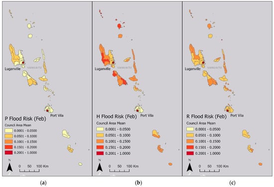 While the results were calculated to a high resolution, the values were summarised to the Council Area to allow for a comparison of results at the country zoom level. Figure 17a shows the summarised population flood risk for February, as shown previously in Figure 16. Comparing the domains of populations, households and roads, households show higher risk values, particularly in the northern provinces, while the population risk is moderate-to-low across the country. In general, risk in all domains is relatively low in Efate Island. As the mean value of all cells is taken for each Council Area, population risk values are seen to be lower as the exposure data cover the whole country, whereas households and roads have many gaps. This led to more cells with low exposure values for the population, lowering the overall mean risk.