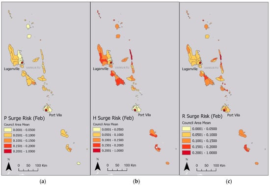 The regions of higher (0.1–0.2) AR values in the February map show which regions have received more rainfall on average in the month of February since 1980. These light green regions seem to correlate with higher elevation and mountainous features in the northern islands. Despite there also being mountains in Efate and more southern islands, rainfall seems to be more common in the north, closer to the equator. Values for February were very low compared to those from the case study TCs. This is because the expected AR over 5 days in February is compared to 5 days during a rare extreme TC event. Within the method, the maximum accumulated rainfall value over 5 days found for TC Harold was used as the maximum value in the linear normalisation of all maps. This set the highest value of one as the amount of rainfall reached the wettest spot during TC Harold, giving meaning and perspective to all other values. In previous risk assessments, indicator values often were not calibrated to anything meaningful [31], limiting observations to just comparative statements, such as one region had higher values than another and thus would contribute to higher risk.