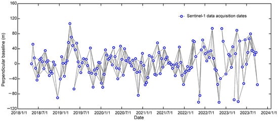 To acquire historical deformation data and predict future deformation trends in the study area, we collected 158 images from the terrain observation with progressive scans (TOPS) interferometric wide (IW) mode of the Sentinel-1A synthetic aperture radar (SAR). These images, utilizing VV polarization, spanned from 3 May 2018 to 4 October 2023. The Sentinel-1A satellite, launched on 3 April 2014, has a revisit cycle of 12 days and operates at a wavelength of approximately 5.6 cm. The images were captured along the descending orbit track T150. The swath width of the Sentinel-1A imagery was 250 km, with the line-of-sight (LOS) incidence angle varying between 31° and 46°.