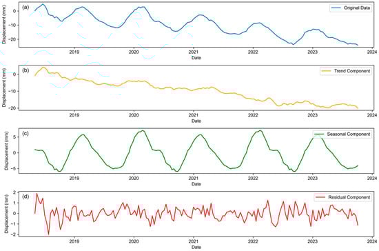 Deformation time-series decomposition feature diagram. (a) InSAR time-series deformation; (b) trend component of displacement; (c) seasonal component of displacement; (d) residual component of displacement.