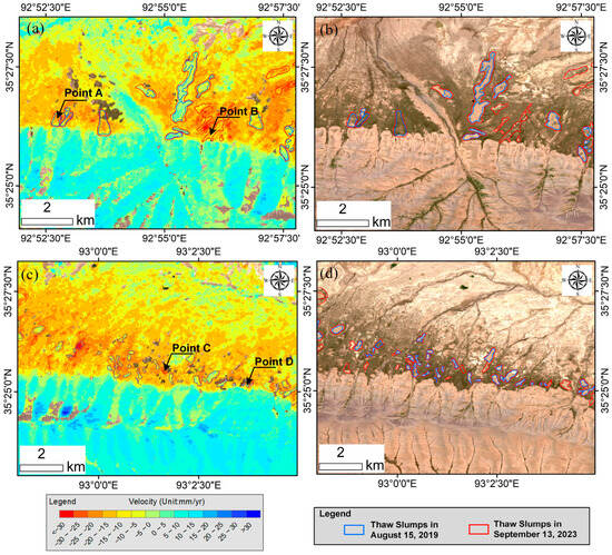 Retrogressive thaw slump boundaries in 2019 (blue) and 2023 (red), manually extracted from Sentinel-2B images. (a,c) LOS velocity of Points A–D, (b,d) Sentinel-2B images of the areas of Points A–D.
