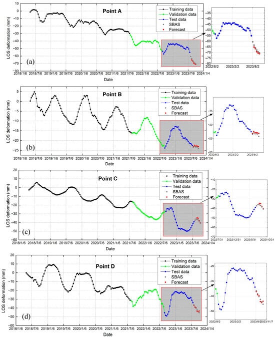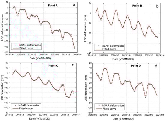 The predicted InSAR time-series deformations at Point A (a), Point B (b), Point C (c), Point D (d).