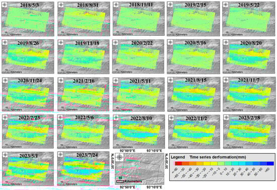 The deformation pattern of permafrost exhibits periodic characteristics of freezing uplift and melting subsidence. Considering the local characteristics of the periodic components in the permafrost deformation pattern, to enable the Spacetimeformer models to learn the complete freeze–thaw cycle deformation pattern, we set the length of the training dataset’s time series to 100 (after interpolation, the total length of the InSAR time series deformation samples was 166, spanning from 3 May 2018 to 3 August 2021, covering three and a half freeze–thaw cycles). The length of the validation dataset was set to 33 (spanning from 15 August 2021 to 3 September 2022), and the test dataset was set to 33 (spanning from 15 September 2022 to 4 October 2023). For each dataset, the context_points parameter was set to 24, and the target_points parameter was set to 6, meaning the model used 24 previous time points for learning and prediction and predicted the deformation data for the next 6 time points, corresponding to 72 days of predicted InSAR time-series deformation data (with a 12-day interval). The weights of the Spacetimeformer neural network were iteratively updated using the AdamW optimizer [58], with a batch size of 16 and a training step length of 500. The initial learning rate was set to 1 × 10−10, and the base learning rate was set to 5 × 10−4. During inference, the trained Spacetimeformer model was used for estimating the time-series deformation prediction values for each pixel. Finally, the predicted time-series deformations for each category were geocoded, resulting in the generation of post-prediction time-series deformation maps.