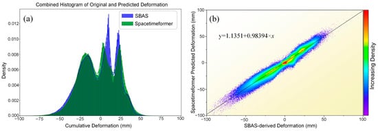Figure 10 shows the time-series displacement from 3 May 2018 to 24 July 2023, a period of five years. Due to the freeze–thaw cycles of the permafrost, noticeable seasonal variations in the time-series deformation maps of the study are were observed. The comparison of time-series displacement between the Spacetimeformer model and the SBAS method from 5 August 2023 to 4 October 2023, as well as the residual map between the two methods, is shown in Figure 11. It was observed that the deformation map predicted by the model was essentially consistent with the deformation map monitored through the SBAS method during the same period. Although local high residuals were present in the time-series difference map, the overall prediction deviation remained within 20 mm, demonstrating the model’s effective predictive performance. To further illustrate the predictive performance of the Spacetimeformer model, Figure 12a presents a histogram comparing the monitored cumulative deformation with the predicted cumulative deformation, for 4 October 2023. There was no discernible difference between the cumulative deformation maps derived via the Spacetimeformer model and the SBAS method. The average values of the monitored and predicted deformation maps were −6 mm and −5 mm, respectively, with standard deviations of 45 mm and 42 mm, respectively. Figure 12b shows the point density distribution of the two results. The density distribution of predicted deformation was consistent with that of the Sentinel-1A data results, and the fitting result R2 was 0.95, confirming the validity of the predicted results.