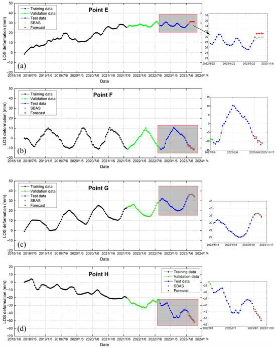 The predicted InSAR time-series deformations at Point E (a), Point F (b), Point G (c), Point H (d).