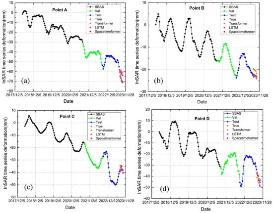 InSAR time-series deformation curves based on LSTM, transformer, and Spacetimeformer models at Point A (a), Point B (b), Point C (c), Point D (d).