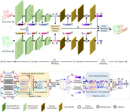 where , , , , , , , and are the learnable weights of the corresponding point and overlap prediction linear layers in the output decoding module. We concatenate the dense points located in the common area with the predicted corresponding points . Similarly, we concatenate the dense points within the common area with the network-predicted corresponding points . After concatenation, we obtain dense matched points and in the overlapping region with a data length of . The corresponding overlap score is denoted as , and the formulas are defined as follows:
