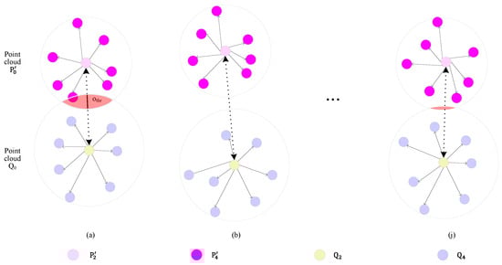 where represents a superpoint obtained by downsampling the point cloud , and denotes a dense 3D point of that needs to be grouped. The symbol denotes the Euclidean distance of 3D points. The same grouping strategy is applied to the other point cloud .