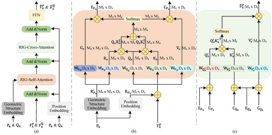 Overview of our RIG-Transformer module: (a) depicts an overall computation of the RIG-Transformer module, (b,c) depict the RIG-self-attention and RIG-cross-attention.