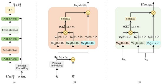 The computational process of the cross-attention is illustrated in Figure 5c. Subsequently, we input and into the cross-attention module (c) in sequential order (first and then ), and compute the interacted feature , which integrates more accurate encoding of dense spatial coordinates and contains global feature interaction information of the point cloud to be matched, thus possessing better discriminative power. The corresponding formula for this computation is defined as follows:
