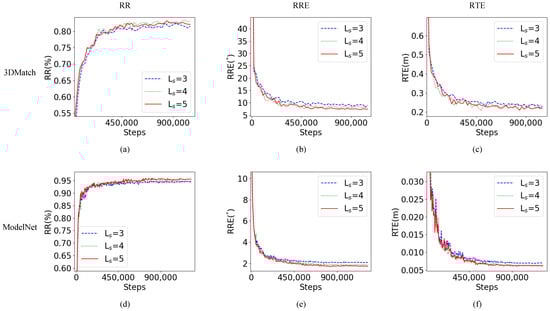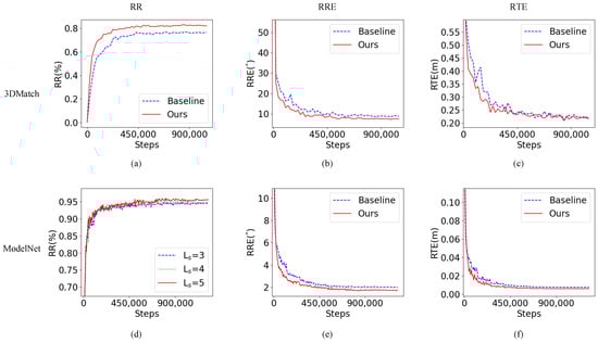 The evaluation curves during the training process for 3DMatch (a–c) and ModelNet (d–f).
