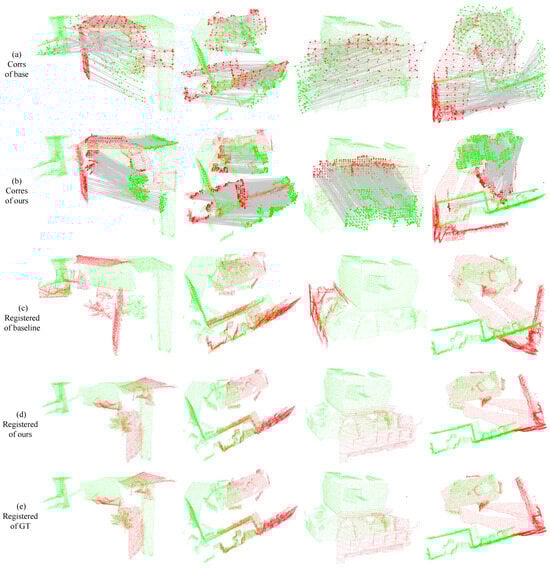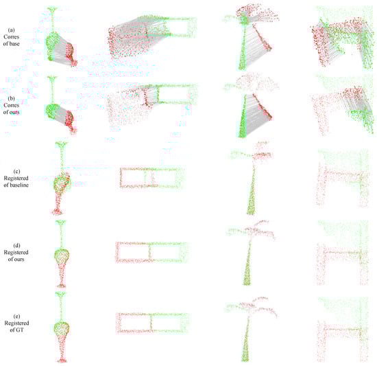 The performance of our method on ModelLoNet. Columns correspond to different point cloud pairs. The red and green points signify point cloud and . Row (a) shows the superpoint correspondences obtained by the baseline method, row (b) displays the dense point correspondences computed by our method, row (c) illustrates the registration of the baseline, row (d) depicts the registration of our method, and row (e) showcases the registration using ground truth poses.