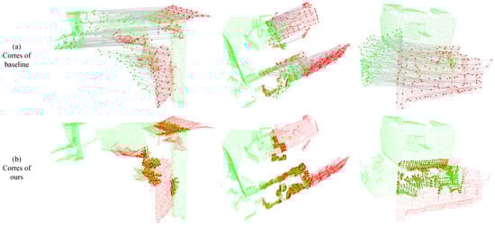 Predicted 3DLoMatch overlap area. Points in red and green represent point clouds and , respectively; gray lines represent the connection relationship between corresponding points. The first row (a) shows the correspondence of sparse matching keypoints from the baseline, and the second row (b) displays the correspondence of dense points predicted by our model located in the overlapping area, with each row representing a pair of point clouds to be matched.