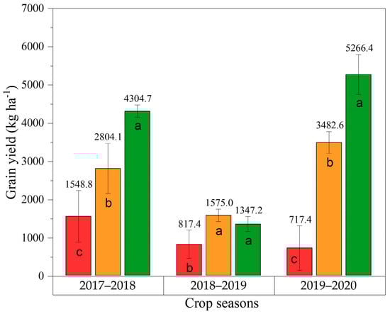 3.2. Soybean Grain Yield in the 2017–2018, 2018–2019, and 2019–2020 Crop Seasons