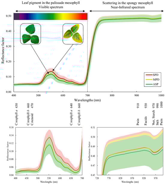 The principal symptoms of nutritional deficiencies, such as the onset of chlorosis followed by leaf tissue necrosis, often correlate with an increase in the reflectance factor in the visible region (500 and 700 nm). This is especially prominent in the treatment with the most significant nutrient deficiency (SPD). A subtle difference in the reflectance spectrum was observed between the MPD and ASP treatments. As MPD did not exhibit visual symptoms of K+ deficiency, its spectral signature was expected to be closer to the nutrient-sufficient treatment (ASP).